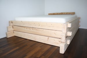 Einlagig überplattetes Vollholzbett aus Fichte. Der besondere Charakter dieses Bettes ist der Kontrast zwischen der strengen, kantigen Linienführung der Holzbalken und dem verspielten, runden Kopfteil aus Tannenholz. Auf das Holz wurde Naturbienenwachs dünn aufgetragen, damit es noch natürlicher wird und dennoch gut geschützt ist.