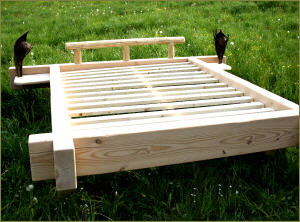 Dieses Bett wurde aus edlem Tannenholz angefertigt. Es besitzt links und rechts eingelassene 1cm dicke Glasplatten, die als Nachttisch dienen.