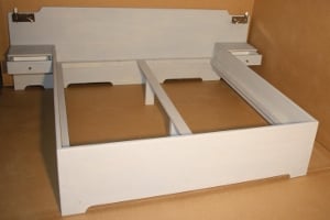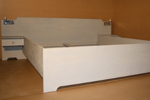 Es besitzt links und rechts eingelassene 3,7cm dicke Holzablagen, die als Nachttisch dienen. Das Bett wurde mit einem weissen Ton leicht überzogen und gespachtelt, dadurch erhält es einen Vintage- bzw. Shabby Chic Style.