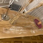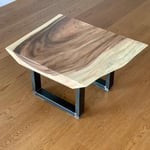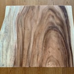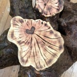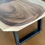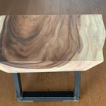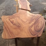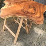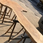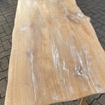 Er ist aus dem Kernholz des Baumes herausgeschnitten und bildet somit die gesamte Tischplatte.