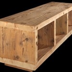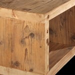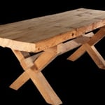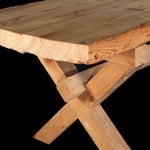 Tisch aus Altholz (Kiefer) mit überkreuzten Beinen.