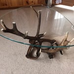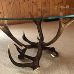 Couchtisch Landhaus aus Rothirsch Geweih freistehend mit Glaskantenstempel das vhs Glas liegt auf den Spitzen der echten Rothirsch Geweihstangen auf. Das Tischgestell besteht aus 4