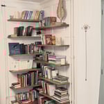 Die Konsolenwinkel sind in das Holz eingefräst und zusätzlich mit einem Seitenholz befestigt, somit erscheinen diese als schwebende Tablare. Diese sind auf Mass angepasst und zweimal mit Bio Bienenwachs versiegelt.